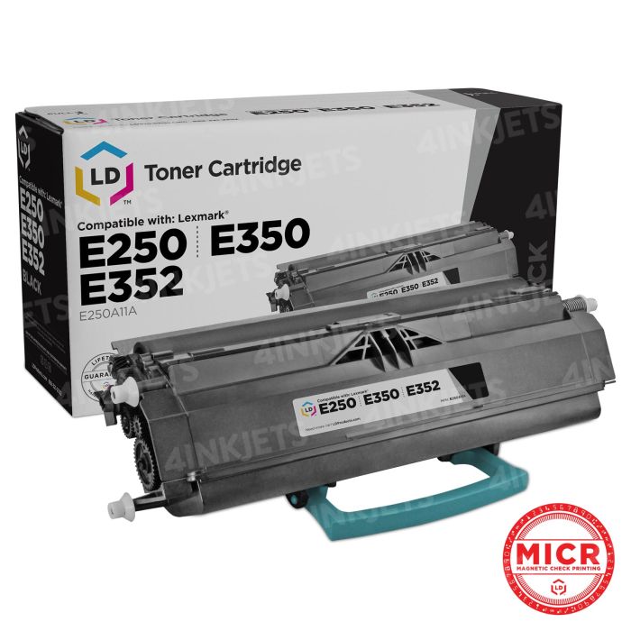 This is a remanufactured Lexmark E250A11A high yield black laser toner cartridge guaranteed to perform with your Lexmark laser printer. MICR toners are specifically designed for printing professional checks, made possible by a special iron in the toner that allows the check to be detected and passed through a bank's scanning system. The remanufactured replacement E250A11A laser toner cartridges and supplies (also known as generic) are specially engineered to meet the highest standards of quality, reliability and exceptional yields that meet or exceed OEM (Original Equipment Manufacturer) standards for the E250A11A and offer high-quality printing results. Containing up to 60% new parts including wiper blades, and other internal parts, they are an economical alternative to expensive OEM E250A11A Lexmark laser toner cartridges and supplies, and offer big savings over brand-name E250A11A laser toner cartridges and supplies. The use of remanufactured replacement laser toner cartridges and supplies does not void printer warranty.