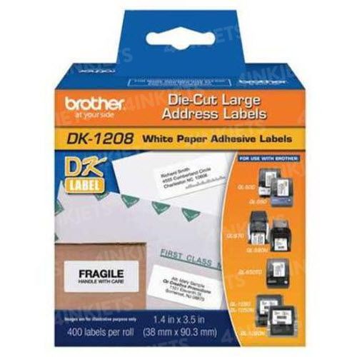 This is an original, OEM Brother DK-1208 white paper address labels for your QL label printer. The Brother DK-1208 paper address labels deliver consistent printing results. DK-1208 address labels are 1.4 in x 3.5 in (38 mm x 90.3 mm). Print excellent, crisp labels ideal for both home and office use with the Brother DK-1208 paper address labels. Each roll includes 400 labels.